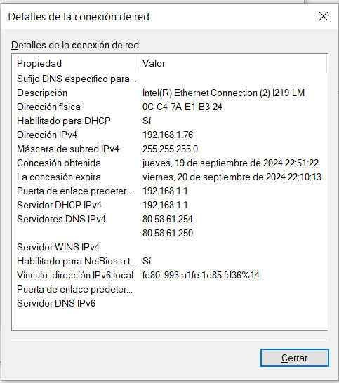 Lo hago y miro un ipconfig /all