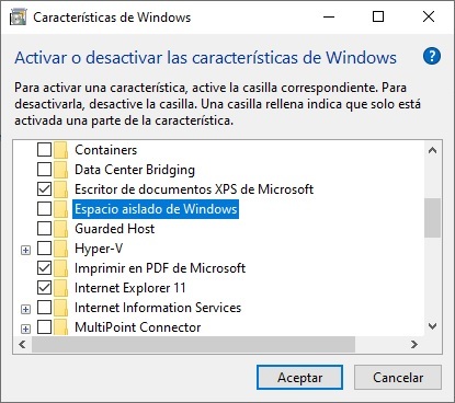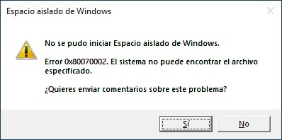 Sin embargo, cuando intento activar Windows Sandbox [en características de Windows aparece como "Espacio aislado de Windows"] una vez finalizado el proceso y reinicializado el sistema, al pulsar sobre Windows Sandbox del Menú inicio aparece al rato una advertencia indicando que se ha producido el error 0x80070002 al no poderse localizar el archivo.