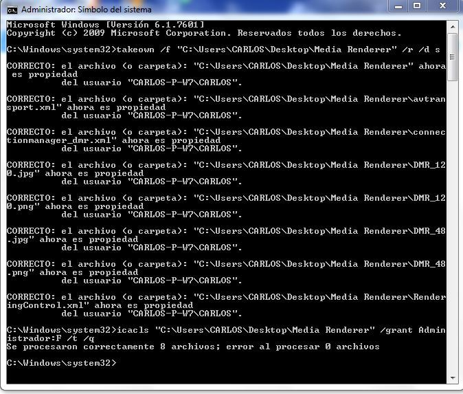 icacls "C:\Users\%user%\Desktop\Media Renderer" /grant Administrador:F /t /q