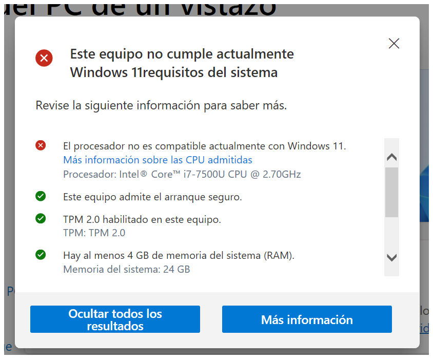 Tan ufano andaba buscando el momento de actualizar mi ThinkPad y me encuentro que su CPU Core i7 - 7500U a 2.70 Ghz y 4 Cores no es compatible con la tecnología 24H2.